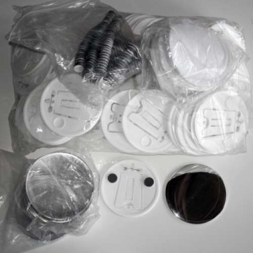 Insigne rotunde diametru Ø 100 mm cu ac, stand foto si magneti, contin trei componente necesare ambutisarii: capac din tabla galvanizata, spate din plastic cu picior de sustinere cu magneti, folie laminare din plastic transparent. Ambutisarea se face cu ajutorul unei prese de insigne pe care este montat matrita pentru insigne de 100 mm.