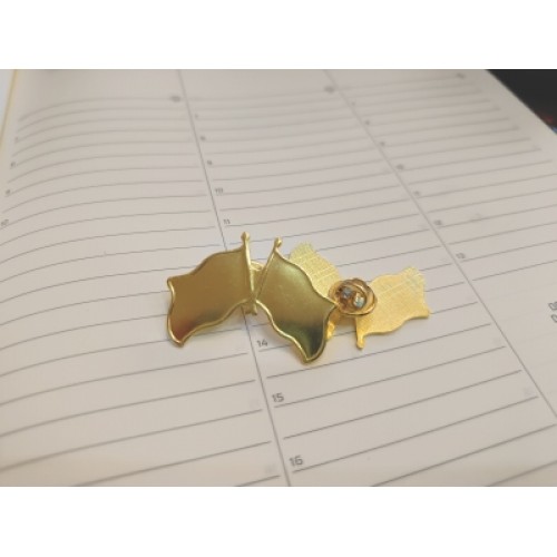 Insigna tricolor din metal auriu,se poate personaliza cu oricare 2 steaguri, cu rasina sau cu autocolant laminat, dimensiune: 36 mm x 22 mm. Prinderea se face printr-un pin pe interiorul hainei asigurand astfel o fixare stabila .